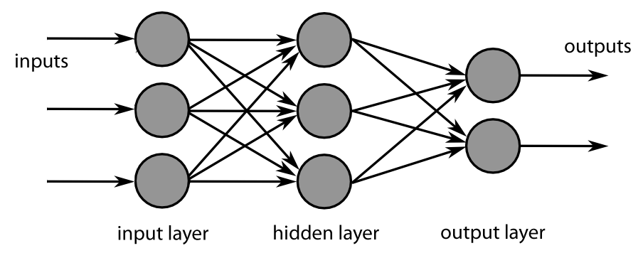 So, you have some “input” neurons, which accept the input to the network, and “output” neurons, which provide the output from the network. And in the middle, you have one or more “hidden” layers. And each of the connections between the neurons (represented by arrows in the diagram) have different strengths that can be either positive or negative. So a single number can be used to set the strength of each connection, from, say, -1 to +1.