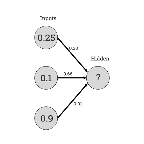 So, to figure out the state of the hidden neuron, we take the inputs, multiply by the weights of their connections, and sum them up: